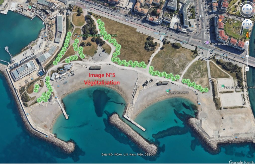 Questions AMENAGEMENTS possibles, ont été évoqués : la création d’un cheminement piéton plutôt proche du trait de côte, incluant la base nautique, et allant jusqu’à la Pointe Rouge, l’amélioration de la piste cyclable à partir de l’Huveaune, des toilettes toute l’année, des girouettes et/ou éoliennes artistiques, de vrais snacks de plage, des rampes légères aidant l’entrée et la sortie de l’eau aux PMR, personnes âgées… , la plantation de végétaux résistants aux embruns tels que des tamaris.